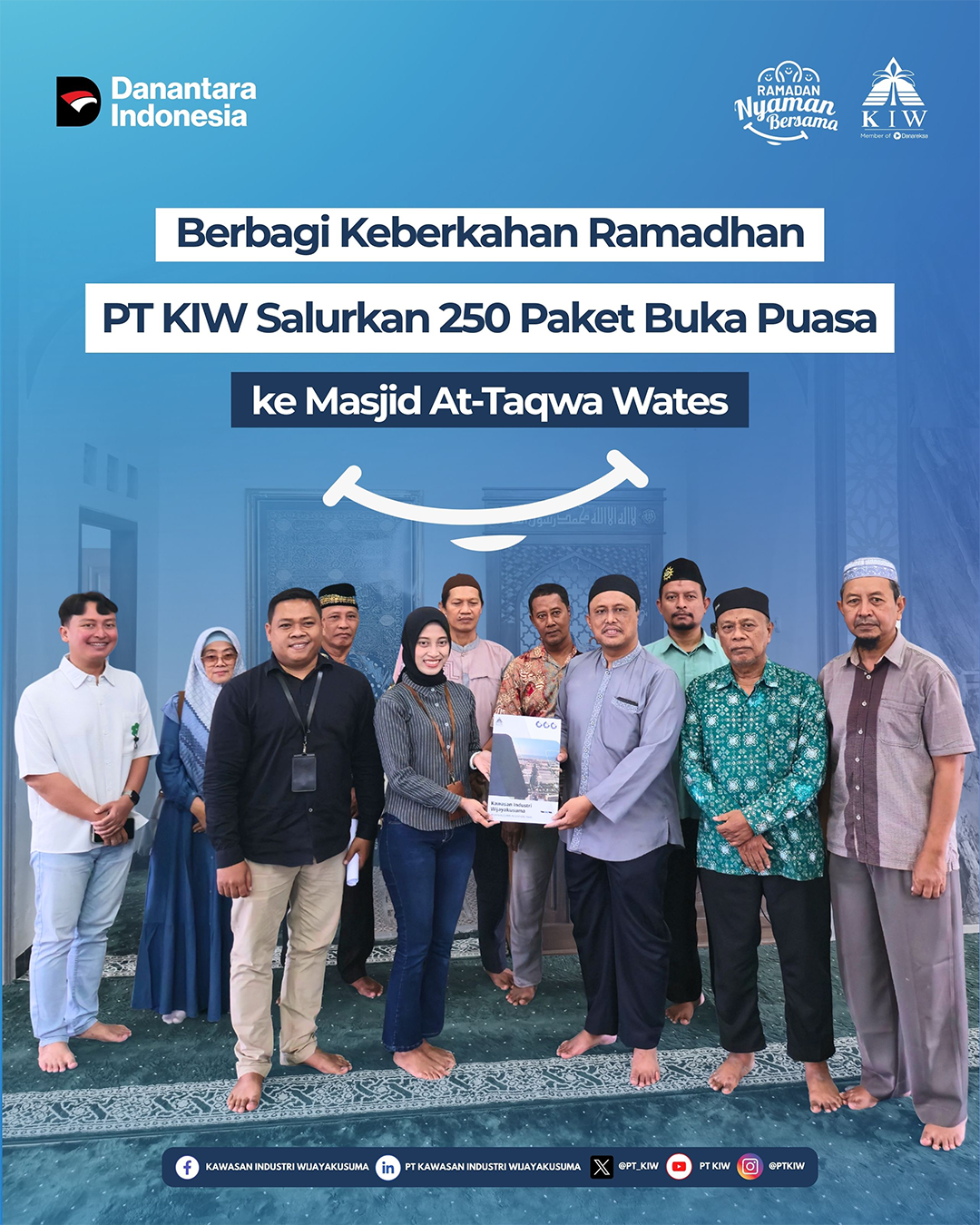 Penyerahan bantuan dilakukan secara simbolis pada Kamis, 05 Maret 2026, yang dihadiri oleh perwakilan Tim TJSL PT KIW serta pengurus Masjid At-Taqwa Wates.